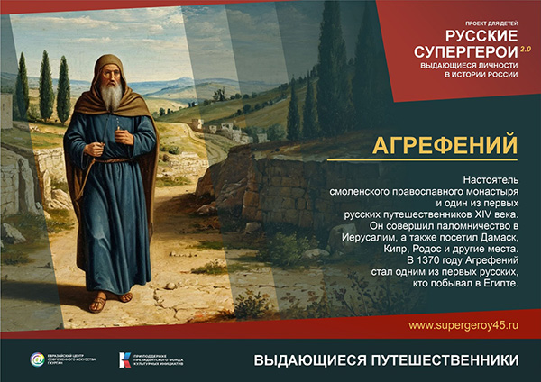 Агрефений. Настоятелем смоленского Богородичного монастыря и одним из первых русских путешественников XIV века. Он совершил паломничество в Иерусалим, также посетил Дамаск, Кипр, Родос и другие места, а в 1370 году стал первым русским, кто побывал в Египте. В своём «Хождении» смоленский паломник кратко описал Каир и Александрию, а также особенности мест, которые он посетил.