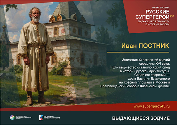 Иван Постник (Постник Яковлев). Знаменитый псковский зодчий середины XVI века. Его творчество оставило яркий след в истории русской архитектуры. Среди его творений — храм Василия Блаженного на Красной площади в Москве и Благовещенский собор в Казанском кремле.