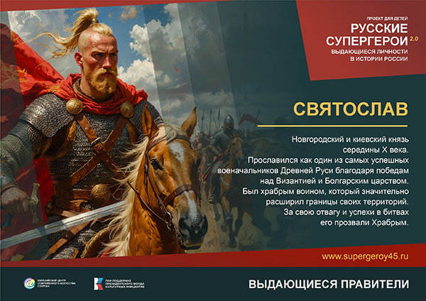 Святослав Игоревич. Новгородский и великий киевский князь середины X века. Он прославился как один из самых успешных военачальников Древней Руси благодаря победам над Византией и Болгарским царством. Святослав Игоревич был храбрым воином, который значительно расширил границы своих территорий. За свою отвагу и успехи в битвах его прозвали Храбрым.