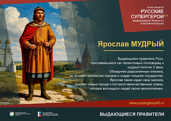 Ярослав Мудрый. Выдающийся правитель Руси, прославившийся как талантливый полководец и мудрый политик X века. Объединив разрозненные племена, он основал множество городов и создал мощное государство. Ярослав также издал свод законов, основал новые города и построил величественные храмы, которые восхищали людей своим великолепием.